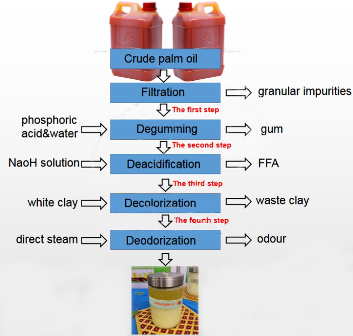 • Deodorization: Palm oil may have some unpleasant odors. In the deodorization process, the oil is heated under vacuum conditions, and steam is introduced. The steam strips off the odor – causing substances in the oil, thereby obtaining refined palm oil with good odor and quality.