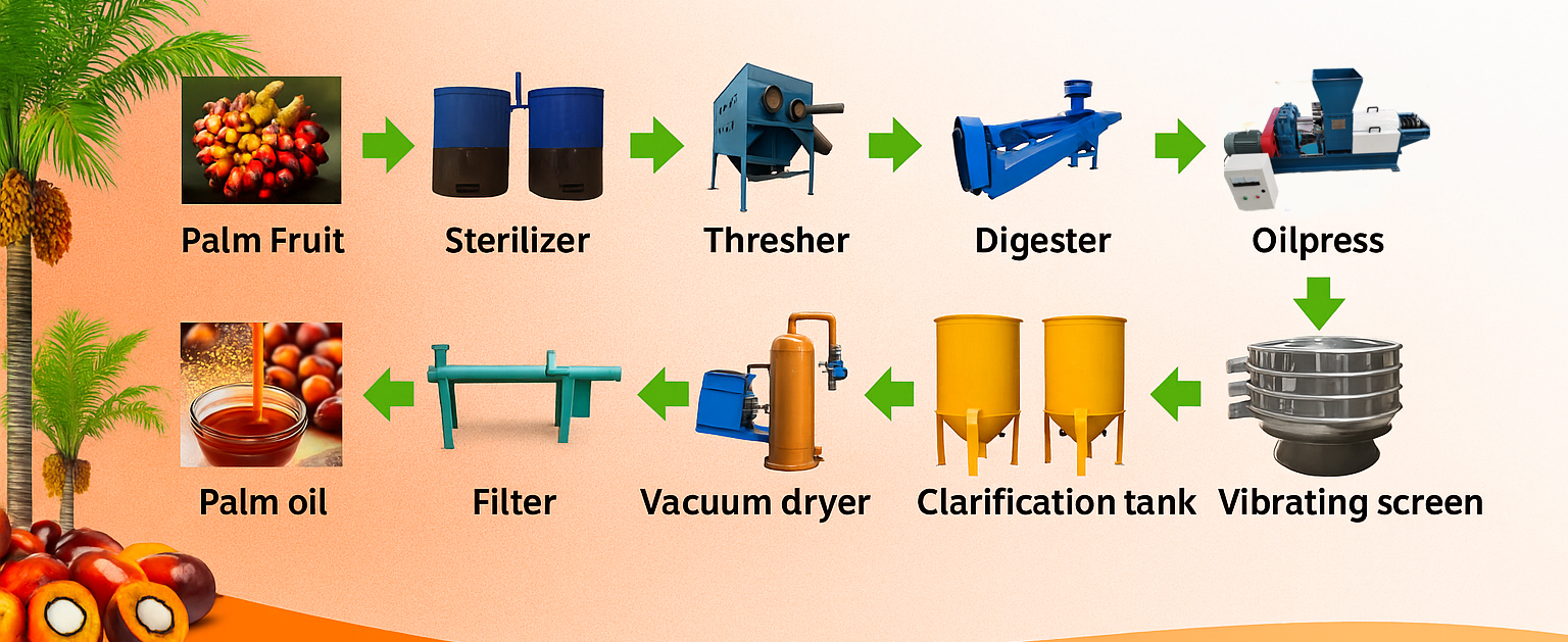 A standard small-scale production line involves several automated or semi-automated steps to extract crude palm oil (CPO):