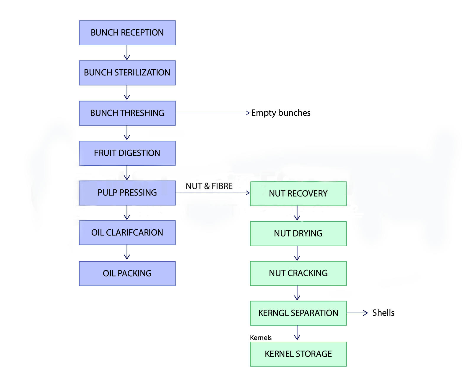 The palm nuts remaining after pressing are processed to recover palm kernels.
